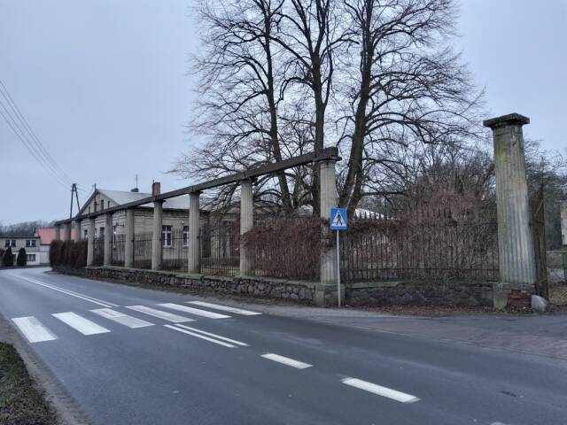 Wjazd do pałacu następuje poprzez okazałą bramę znajdującą się pomiędzy wspaniałymi kolumnami które zdobiły rzeźby lwów podtrzymujące łapami tarcze herbowe .Bramę otaczała dorycka kolumnada .Ogrodzenie pałacu jest murowane i pochodzi z 1913 roku.