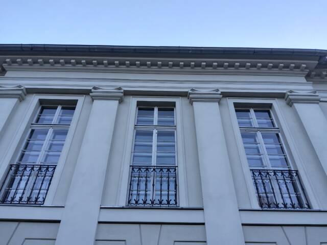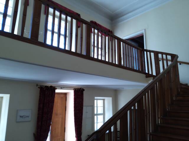 Pomieszczenia reprezentacyjne usytuowane są na piętrze dokąd prowadzą reprezentacyjne schody .