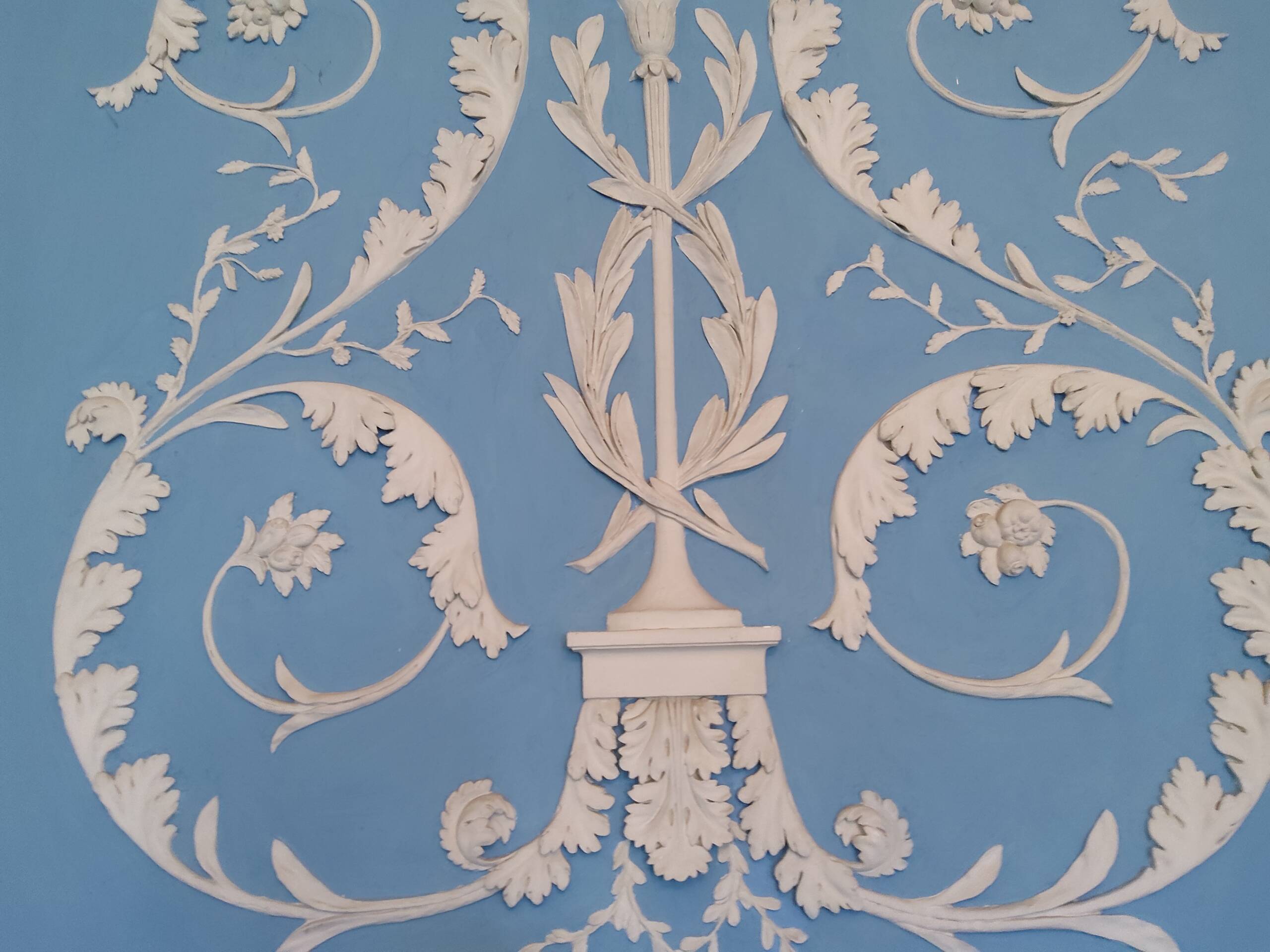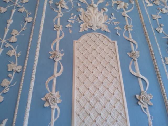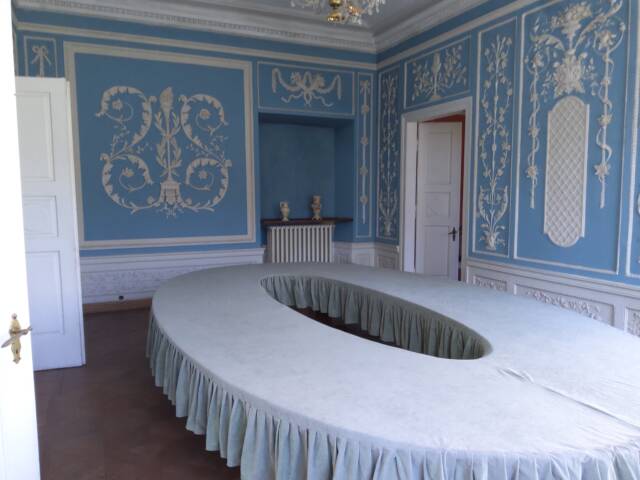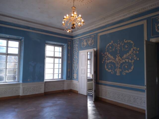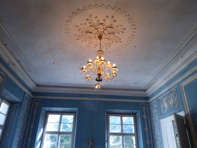 -salonik niebieski gdzie królują bogate sztukaterie o motywach roślinnych,