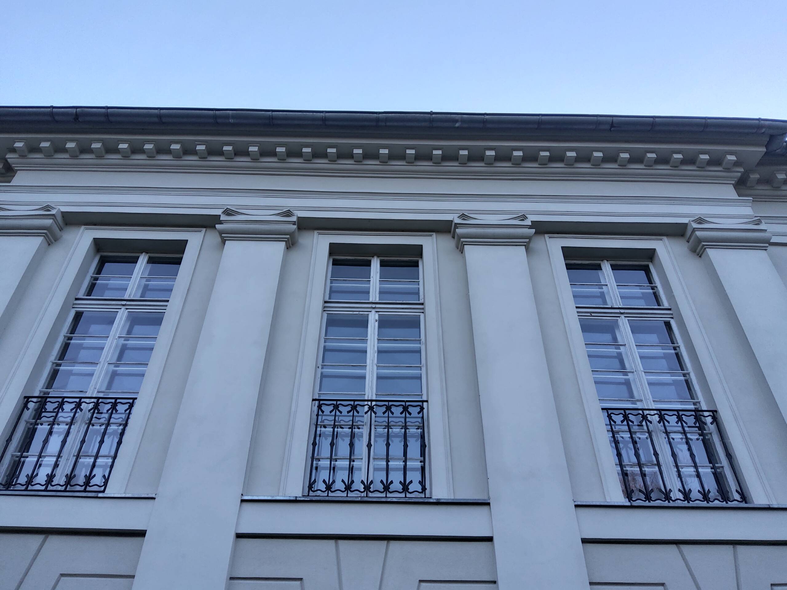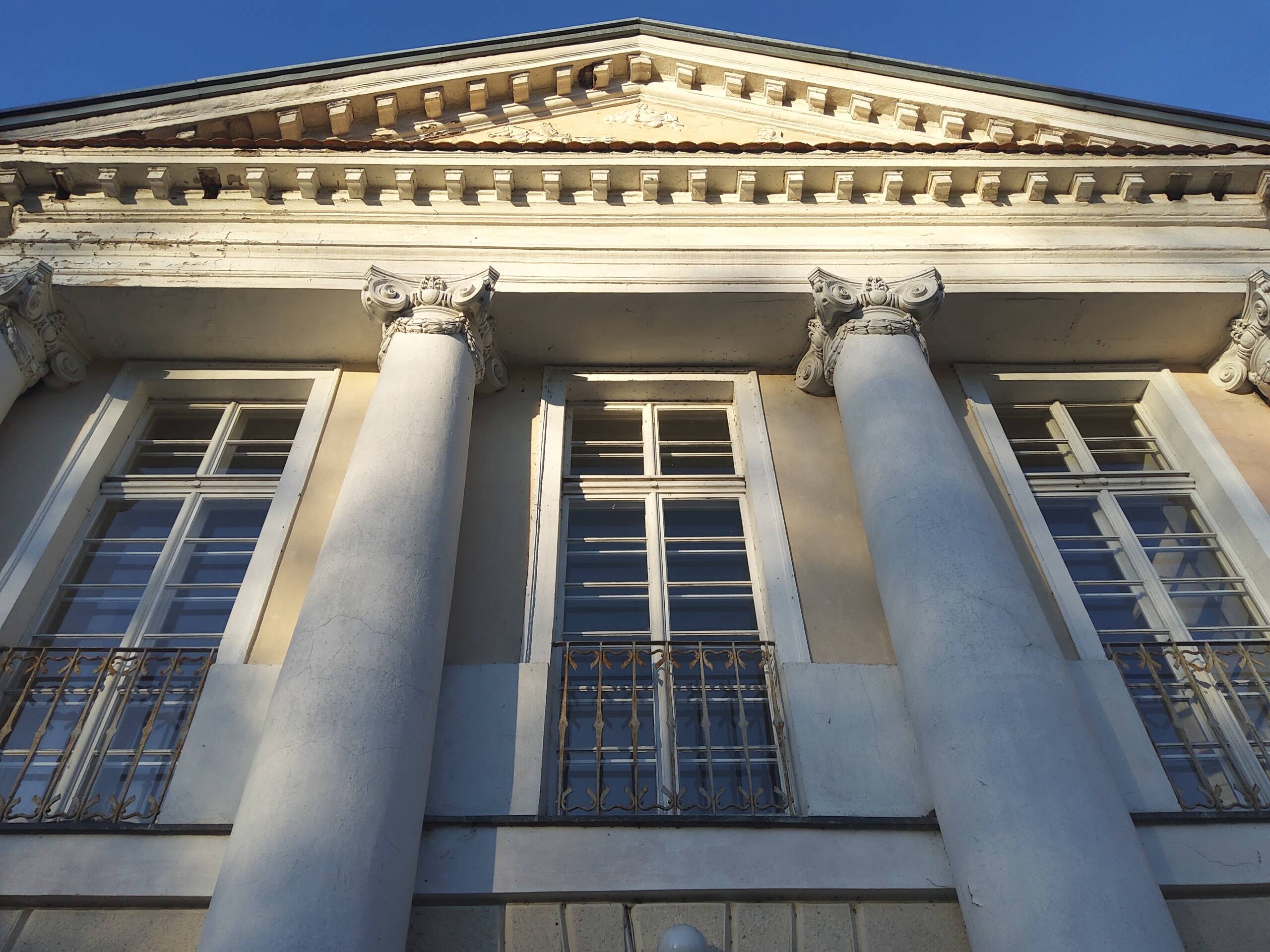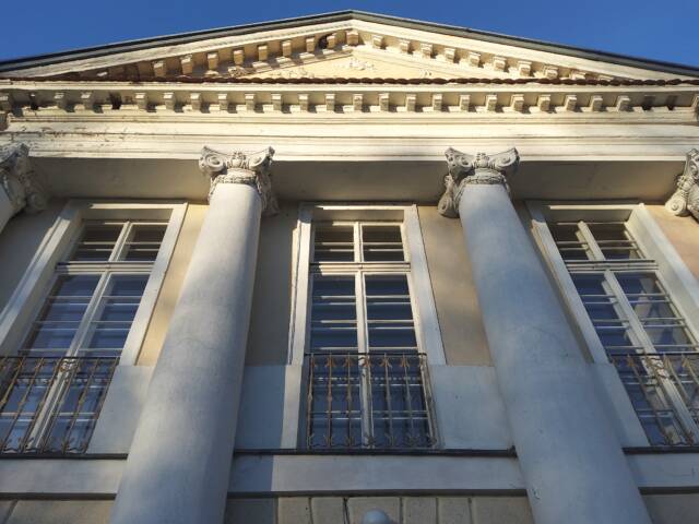 Od frontu majestatyczności nadaje portal czterokolumnowy zwieńczony trójkątnym tympanonem z płaskorzeźbą z rydwanem Heliosa oraz dwa wydatne ryzality boczne.