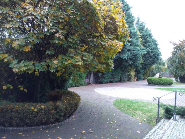 Piękny ogród ze wspaniałą roślinnością ,ścieżkami wyłożonymi kostką granitową ,miejsca parkingowe utwardzone kostką .